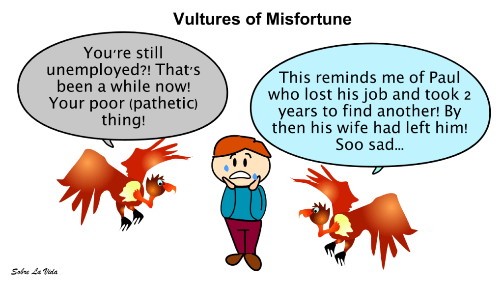 These are people that at the faintest whiff of potentially bad news can barely conceal the eagerness to flock closer, attracted by the sweet scent of someone else’s misfortune. They want to discuss how bad your situation is, whilst cawking pitying comments and harbingers of doom.