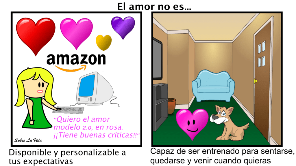 El amor no es un artículo personalizable a medida. No puedes pedir amor en Amazon, comparar las opiniones de los clientes para seleccionar el modelo que deseas y luego exigir que el amor cumpla con todas tus expectativas, o en caso contrario llamar al servicio al cliente y exigir un reemplazo. Tampoco el amor es una especie de poción mágica que satisface todos nuestros deseos y convierte todos tus problemas en felicidad.